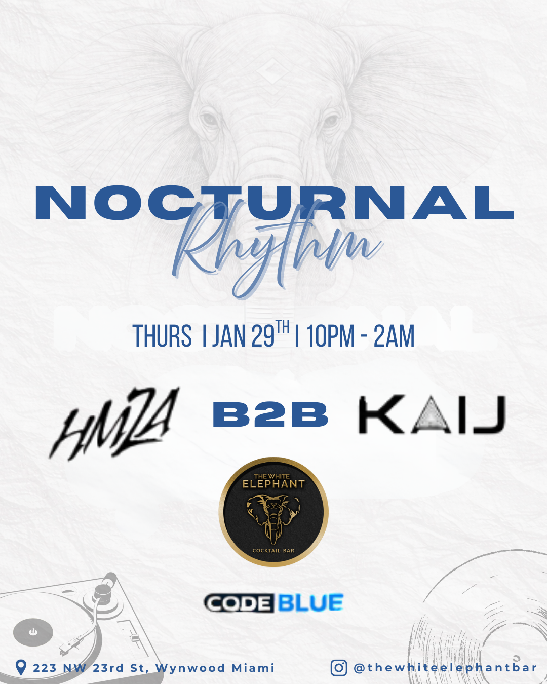 NOCTURNAL RHYTHM is your late-night Thursday house music session in Wynwood Miami—presented by Code Blue Collective at The White Elephant Cocktail Bar.